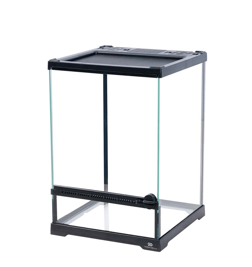 Terra Della terrarium 21×21×30 cm van zwart glas – stapelbaar, waterdicht en met ventilatie. Perfect voor insecten, kleine dieren en kweek.