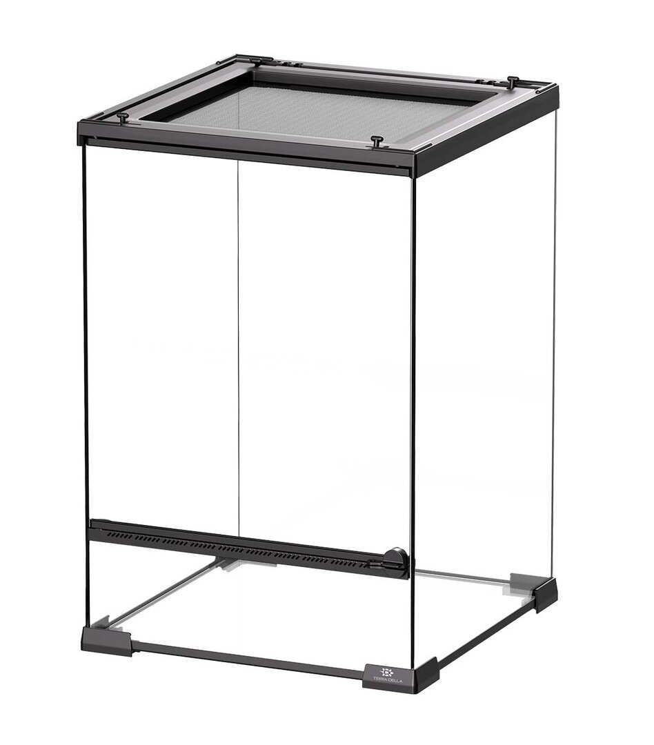 Terra Della terrarium 30×30×45 cm van zwart glas – stapelbaar, waterdicht en met ventilatie. Perfect voor insecten, kleine dieren en kweek.